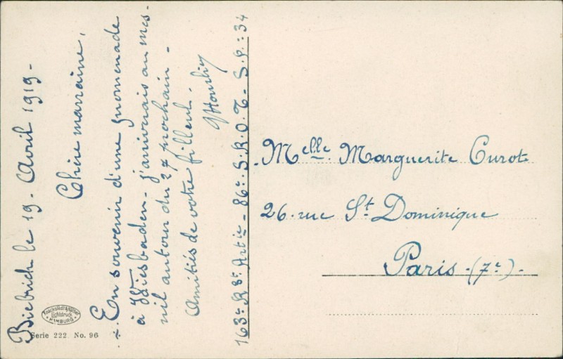 Alte Ansichtskarte aus Wiesbaden, beschrieben am 19.04.1919.