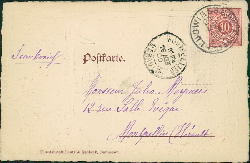 Alte Ansichtskarte aus Ludwigsburg, gelaufen am 24.08.1900 von Ludwigsburg nach Montpellier. Ankunft in Montpellier am 28.08.1900.