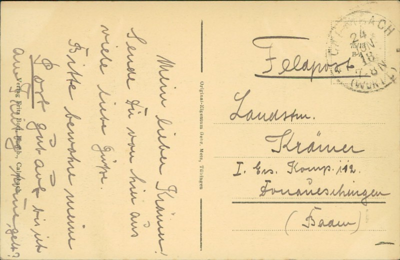 Alte Ansichtskarte aus Bad Wildbad-Calmbach, gelaufen am 24.06.1918 von Calmbach nach Donaueschingen.