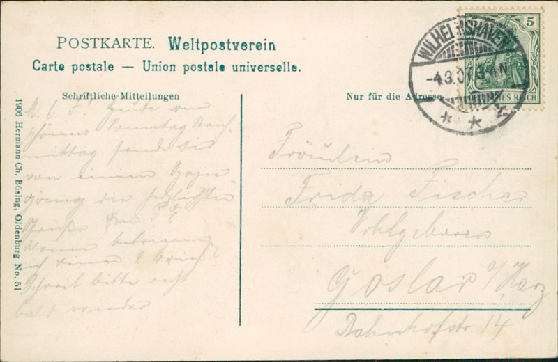 Alte Ansichtskarte aus Wilhelmshaven, gelaufen am 04.03.1907 von Wilhelmshaven nach Goslar.