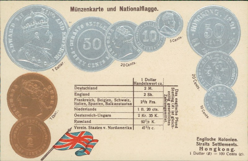 Münzen und Flagge auf Ansichtskarte / states coin card