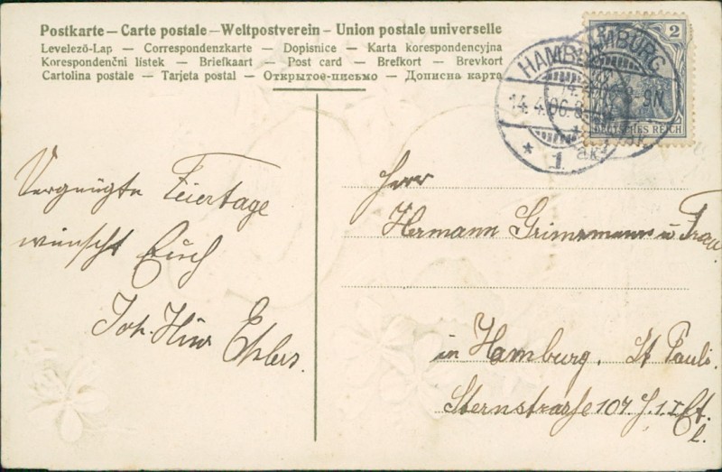 Alte Ansichtskarte, gelaufen am 14.04.1906 von Hamburg nach St. Pauli.