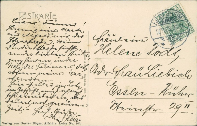 Alte Ansichtskarte aus Alfeld (Leine), gelaufen am 17.11.1908 von Hildesheim nach Essen-Ruhr.
