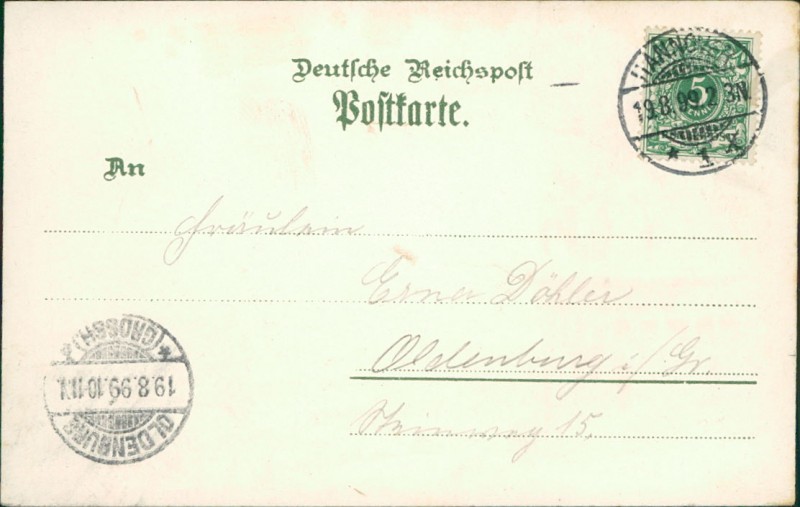 Alte Ansichtskarte aus Hannover-Bemerode, gelaufen am 19.08.1899 von Hannover nach Oldenburg. Ankunft in Oldenburg am 19.08.1899.