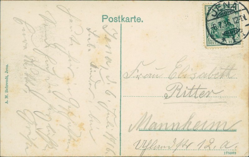 Alte Ansichtskarte aus Jena, gelaufen am 06.07.1916 von Jena nach Mannheim.