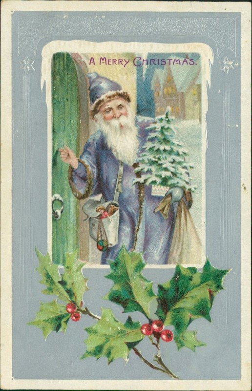 Weihnachtsmann im lila Mantel klopft an die Tür