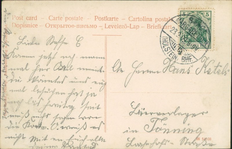 Alte Ansichtskarte aus Brunsbüttel, gelaufen am 28.03.1909 von Sanct Margarethen (Holstein Bhf.) nach Tönning.