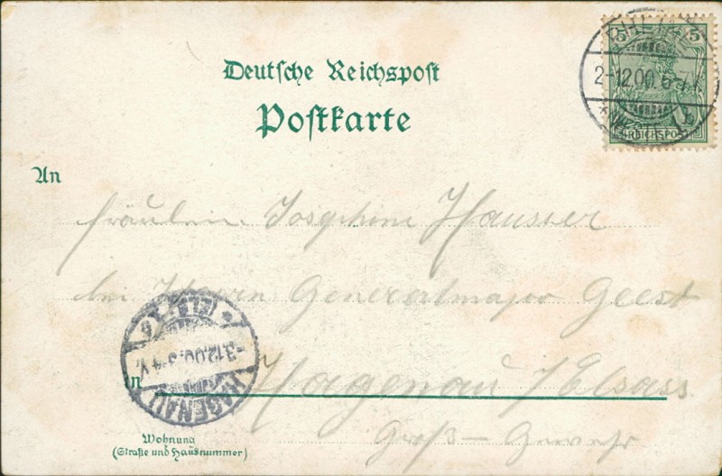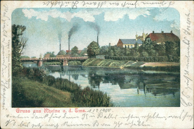 Alte Ansichtskarte aus Rheine, gelaufen am 02.12.1900 von Rheine (Westf.) nach Hagenau. Ankunft in Hagenau am 03.12.1900.