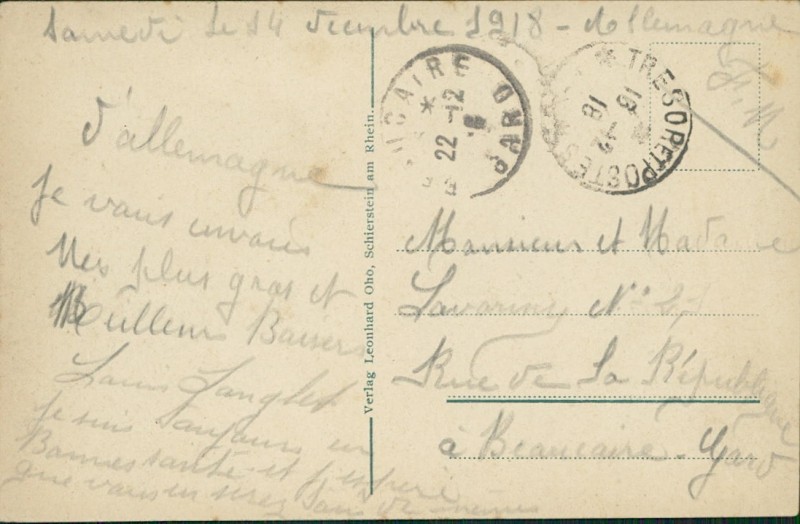 Alte Ansichtskarte aus Wiesbaden-Schierstein, gelaufen am 22.12.1918.